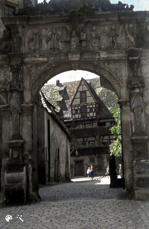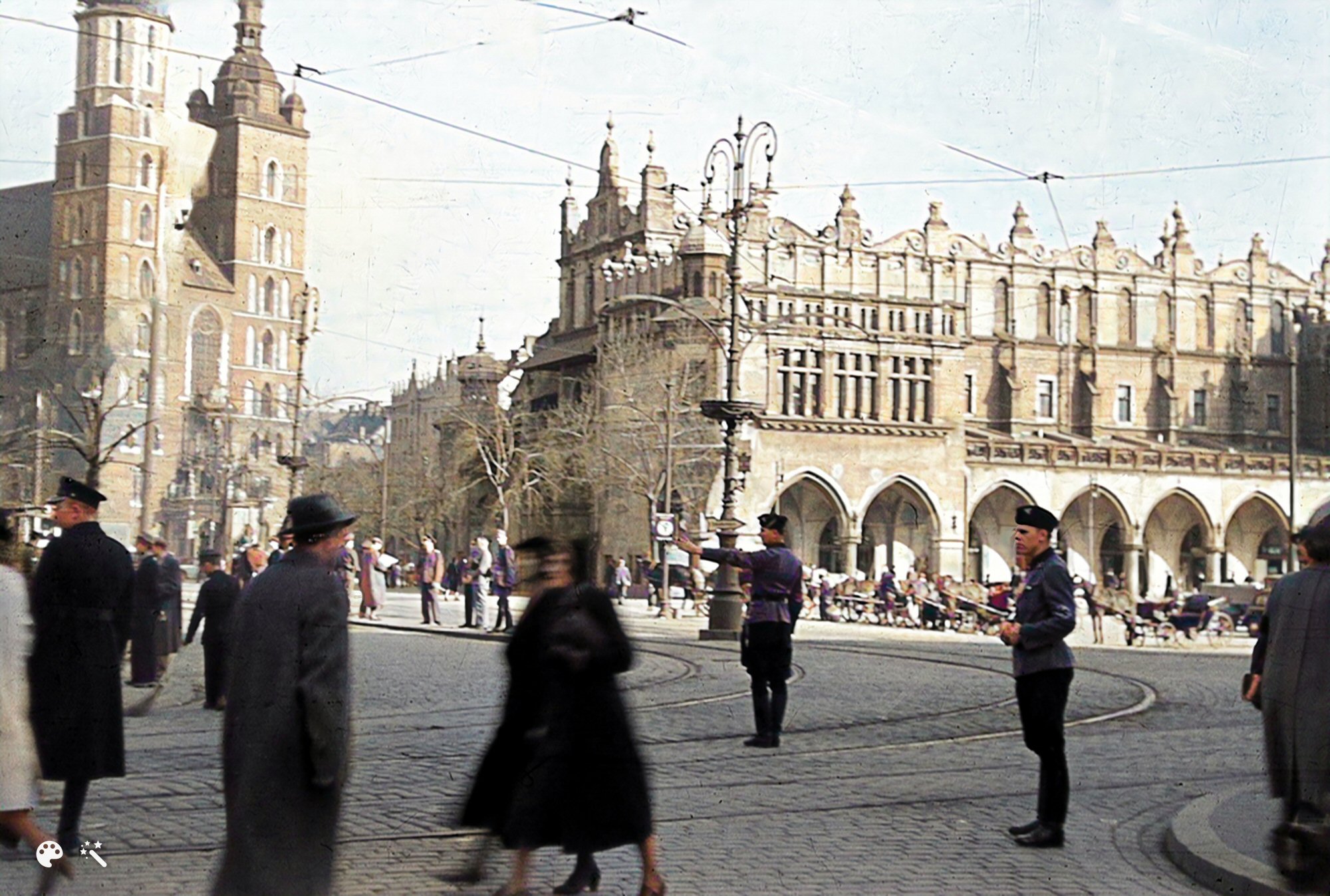 Photo 30: In the original photo, a Nazi banner is overhead, appearing to be between the towers of St. Mary's Basilica.