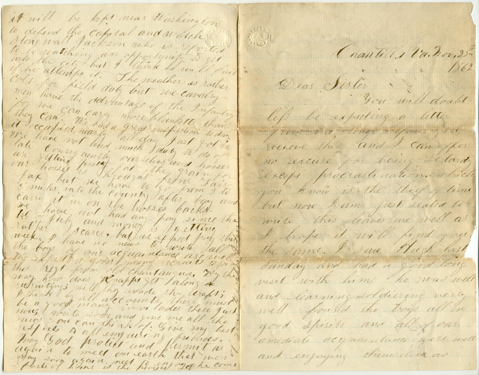 You will doubtless be expecting a letter from me long before you receive this and I can offer no excuse for being so tardy except procrastination which you know is the thief of time but now I am just seated to write this leaves me well as I hope it will find you the same. I saw Hugh last sunday and had a good long visit with him he was well and learning soldiering verry well found the boys all in good spirits and all of our amediate acquaintance were well and enjoying themselves as well as soldiers well could under the circumstances. last week was rainy and unpleasant as Sigles whole division moved back to Centerville and Fairfax. We were verry much surprised when the order came for us to turn back but like true soldiers we obeyed. our regt. had only just moved to the front. our regt. was ordered for rear guard as usual. when ever Gen's. Sigle or Sthall want cavalry that they can depend upon they call on the 9th The army is a great place for petty stealing I will just give you an instance of it. Last Tuesday night where we had encamped for the night - M. Harmon and I had layed down for the [night] using a rubber blanket a our saddle-blanketts for a bed and we had two woolen blanket & a rubber blanket to cover us bet we had not lay there more than half an hour when some scamp slipped one of our wool blankets from under the rubber and got away with it an also a haversack full of hard bread our rations for the next day we thought the trick a cool one our present camp is on the Leesburg turnpike about 6 miles from Fairfax Court House and Hugh is on the same road and only 2 miles from here towards the C.H. and yet it requires a pass from a Major Gen to to pass the pickets that lye between us. Sigles Army Corps is held as a reserve to the whole and I thin perhaps it will be kept near Washington to defend the capital and watch Stonewall Jackson who is reported to be watching an apportunity to get into the city but I think he will fail if he attemps it. The weather is rather cold for field duty but we cavalry men have the advantage of the Infantry for we can carry more blanketts than they can. We had a great inspection today We have not had much duty to do of late consequently ourselves and horses are getting pretty fat the grain for our horses is brought from Fairfax but we have to go from 3 to 5 miles into the country after hay and carry it in on the horses backs. we have not had any pay since the 1st of July and money is getting rather scarce. but we expect pay this week. I have no news to write all the boys of our acquaintance are well We expect a good many recruits to join this regt from old Chautauqua. By the way how does Knapps get along recruiting; will they evade the draft; I think by all accounts there must be a good many invilades there just now; write soon and give me all the news you can think of Give my best respects to all enquiring friends. May God protect and permit us again to meet on earth that we may soon again meet to enjoy the comforts of home is the prayer of your Brother John
