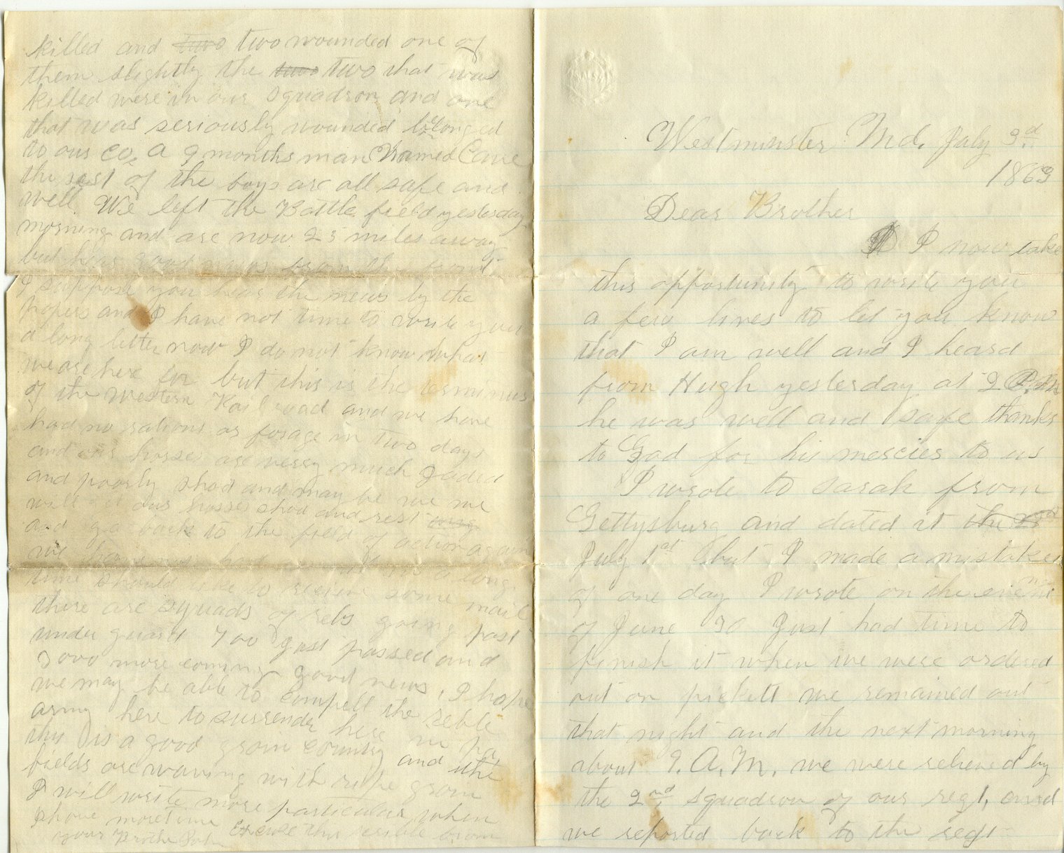 I cannot speak too highly of the people of Gettysburg they threw aside all fear and turned out to take care of our wounded carrying every thing that a soldier could with for killed and two wounded one of them slightly the two that was killed were in our squandron and one that was seriously wounded belonged to our Co. a 9 months man named Cane the rest of the boys are all safe and well. We left the Battlefield yesterday morning and are now 25 miles away but hear govt news from the front I suppose you hear the news by the papers and I have not time to write you a long letter now I do not know what we are here for but this is the terminus of the Western Railroad and we have had no rations or forage in two days and our horses are verry much jaded and poorly shod and may be we we will get our horses shod and rest and go back to the field of action again we have not had mail in a long time should like to receive some mail there are squads of rebs going past under guard 700 just passed and we may be able to compell the reble army here to surrender here in pa this is a good grain country and the fields are waving with ripe grain I will write more particular when I have more time Excuse this scrible from your Brother John