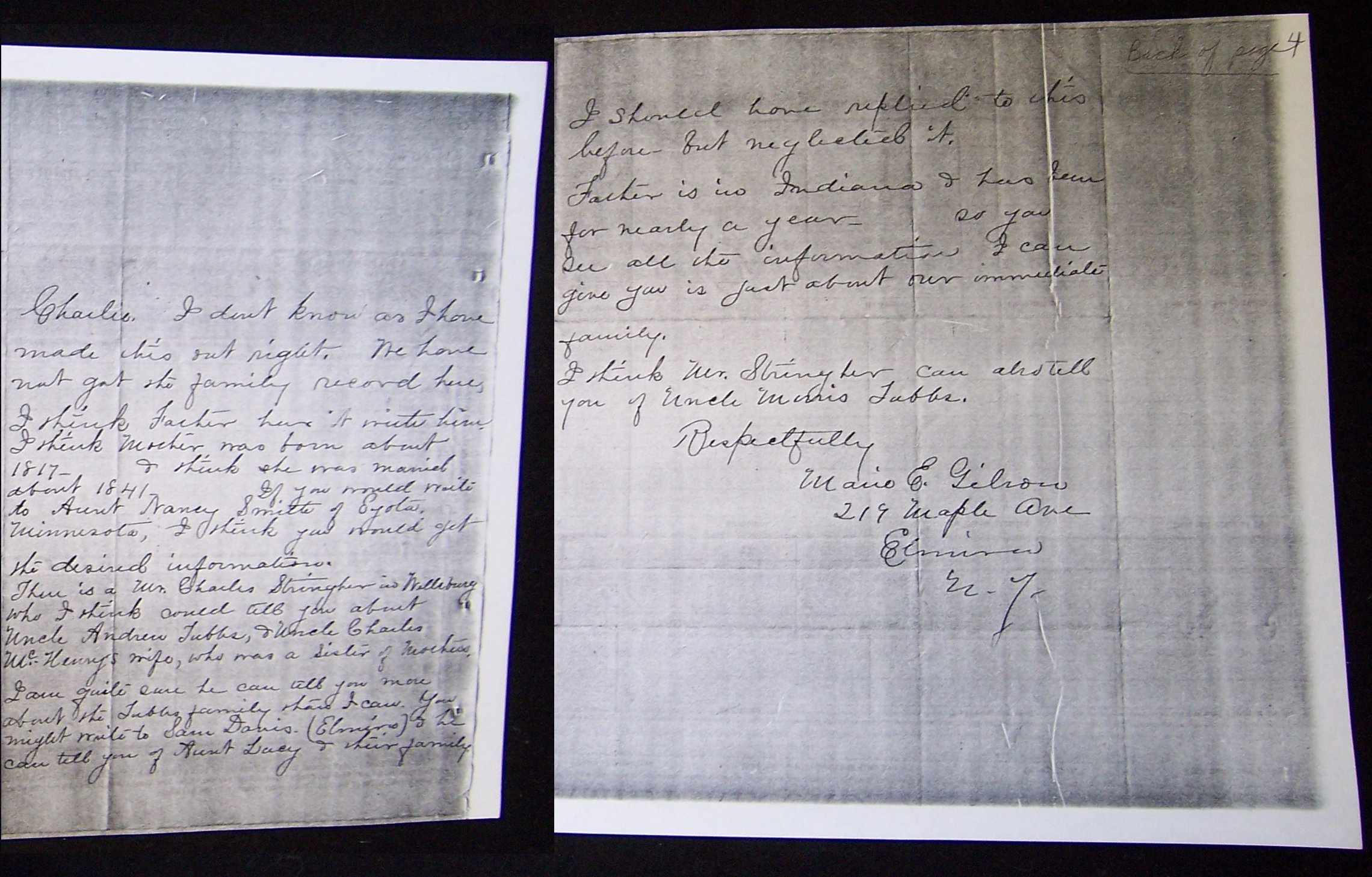 I am the youngest child of Nancy Tubbs Smith and am doing this writing at her request. We are very sorry that it has been so long neglected but mother is very pardonable. On the seventh of last December our house was destroyed by fire and with it our Family Recor, Bible, etc, and our things scattered about. The only reference mother has is from old letters. She has tried very hard to give all the information you asked but has failed in some.